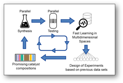 First the AI analyzes existing data and predicts promising catalyst designs. Then automated systems synthesize those materials in the lab. Instruments test their performance. The results feed back into the database, improving the model.